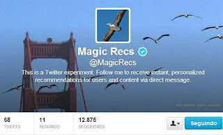 A conta @MagicRecs pode parecer mais uma das inúmeras que oferecem sugestões e recomendações no Twitter , exceto por um detalhe : ela pertence ao próprio Twitter. Isto foi revelado há algumas semanas,por Dick Costolo , referindo-se a ela como "produto de um trabalho excepcional feito pela equipe da " rede social. No entanto, considerando que o Twitter não é muito dado a este tipo de experimentos, várias questões se levantam : O que faz esta conta? Por que agora? Por que não lançaram como uma funcionalidade a mais dentro as que já oferecem ?